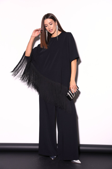 Комплект 2ка, состоящий из блузки и брюк. Удлинённая блузка свободного кроя с ассиметричным низом. Круглая горловина с застежкой вырезом по спинке на навесную петлю и пуговицу. Рукав длиной до локтя.  Низ блузки  декорирован длинной бахромой 30 см . Брюки широкого объема, прямого силуэта. В боковых швах расположены карманы с наклонным входом. Застежка-гульфик. Пояс отрезной, притачной. В задней части пояса вставлена эластичная тесьма (резинка). Пояс застегивается на петлю и крючок.  Рост фотомодели 175 см. Размер у фотомодели – 44.