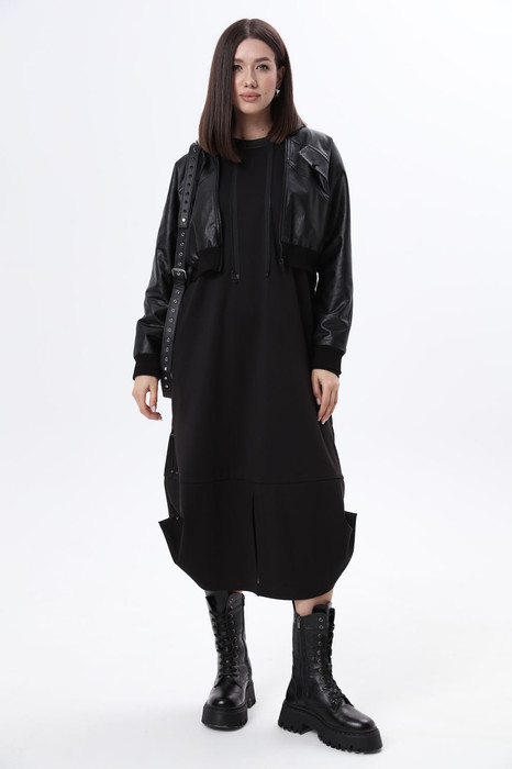 Комплект, состоящий из куртки и трикотажного платья. Платье прямого силуэта , свободного объема, рукав втачной со спущенной линией плеча. По бокам платья расположены карманы и разрезы.По низу переда и спинки разрезы. Также, низ платья по бокам можно регулировать по длине за счет шнуровки и регуляторов. На перед платья настрочены молнии, на которые застегивается съемная куртка. Куртка длинной до талии, крой рукава реглан.По переду расположены клапаны, воротник-стойка. Куртку съемная, ее можно надеть отдельно от платья.  СОВЕТ ОТ СТИЛИСТА: для дерзкого образа сочетайте комплект с грубыми ботинками и массивной сумкой. Для повседневного стиля отлично подойдут кеды или кроссовки.