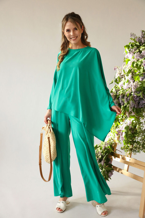 Брючный женский вечерний костюм, который составит достойную конкуренцию привычным платьям. Выпускной, юбилей, даже свадьба – список событий, где будет уместен этот наряд, бесконечен. Блуза костюма имеет не толькоассиметрию по низу изделия, но и различную форму рукавов. Один рукав втачной, с расширенной проймой, а второй «летучая мышь» без бокового шва. Длина рукавов от горловины 64 см. Длина блузы по центру спинки 63 см. Срез горловины в форме «лодочка» обработан обтачкой. Лёгкие брюки оригинального фасона имеют обработку края деталей по бокам и выполнение лишь среднего шва брюк. Модель с глубоким запахом, и полотна находят внахлест.Фиксация брюк на талии осуществляется при помощи петель и пуговиц, что позволяет регулировать плотность посадки. Длина брюк по спинке 100 см.