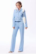 Комплект состоит из жакета и брюк. Жакет свободного кроя, выполнен из жаккардовой ткани с легким мерцанием на подкладке, что дает максимум комфорта в носке. Рукав длинный, линия плеча спущена, округлый вырез горловины, застежка центральная на петли пуговицы, по переду карман листочка. Воротник и манжет съемный.