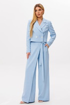 Брюки длинные, широкие, расклешенные к низу. На уровне колена выполнен подрез. Пояс притачной, на резинке.