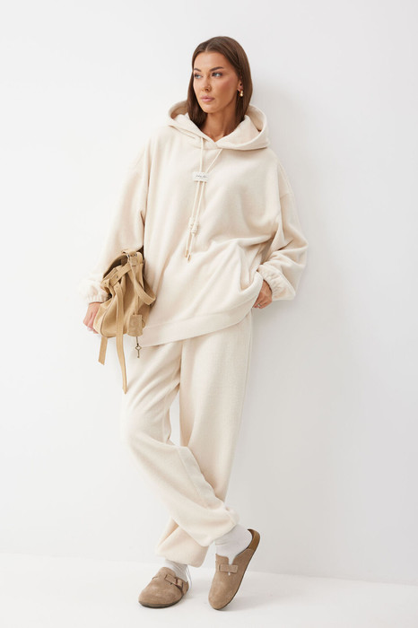 Костюм состоящий из джемпера и брюк. Джемпер прямого силуэта из комфортного трикотажного полотна. Горловина обработана капюшоном. Рукав со спущенной линией плеча, по низу на резинке. По низу джемпера притачной пояс. По переду декоративная нашивка и шнур.