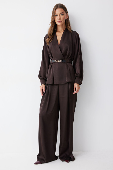 Брюки прямого силуэта расширенные книзу из струящейся ткани. По верху брюк притачной пояс с застежкой на петли и пуговицы. На передних половинках обработана застежка молния в среднем шве. На передних половинках карманы и декоративные складки. По поясу задних половинок брюк резинка и вытачки. Обращаем ваше внимание, что фурнитура может отличаться от фото.