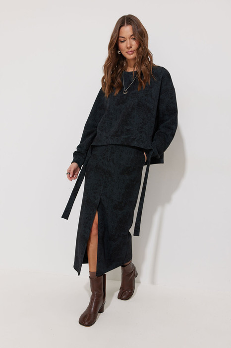 Юбка полуприлегающего силуэта из трикотажного полотна. По верху юбки притачной пояс с резинкой. По переду средний шов со шлицей и карманы. На заднем полотнище юбки накладные карманы.