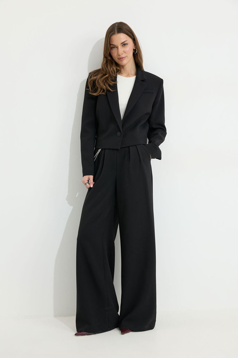Костюм двойка, состоящи их жакета и брюк. Жакет из поливискозной ткани. Полуприлегающего силуэта, линия плеча немного расширена. Жакет укороченный. С отложным воротником и лацканами. По переду застежка  на петлю и пуговицу. По переду отрезные бочки, переходящий на спинку, и талиевые вытачки, по низу  горизонтальные карманы, вход оформлен листочкой. По левой полочке выше линии груди карман-обманка, вход оформлен листочкой. По спинке средний шов. Рукав длинный, двухшовный, с имитацией шлицы; шлица с застежкой на петлю и пуговицу. Жакет на подкладке. Обращаем Ваше внимание, что фурнитура может незначительно отличаться от фото.