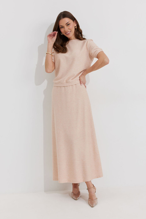 Юбка А-силуэта расширенная книзу из трикотажного полотна. По верху юбки притачной пояс с эластичной тесьмой (резинкой).