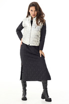 Стильный комплект из платья и жилета. Утепленный жилет прямого кроя с центральной застежкой на металлическую молнию. Горловина обработана стойкой. Жилет дополнен удобными карманами с застежкой на металлические молнии. По низу жилет дополнен скрытой кулиской с эластичным шнуром и фиксаторами. Платье прямого кроя с боковыми разрезами. Выполнено из фактурной ткани с имитацией стежки. Рукав втачной. По спинке застежка на потайную молнию. Спереди платье дополнено термо аппликацией. Длина жилета от плечевого шва 52см. Длина платья от плечевого шва 124см. Длина рукава 60см.