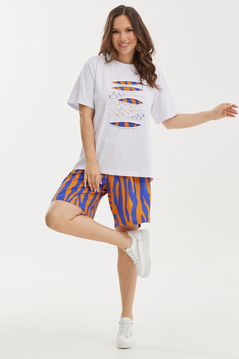 Летний комплект из футболки и шорт. Футболка свободного базового кроя. Дополнена оригинальной аппликацией и вышивкой. Рукав втачной, слегка спущен.  Шорты свободного прямого кроя с притачным поясом, дополненным эластичной тесьмой. Ткань штапель. Дополнены боковыми карманами. Длина футболки от плечевого шва 65см Длина рукава 25см. Длина шорт по боковому шву 50см.