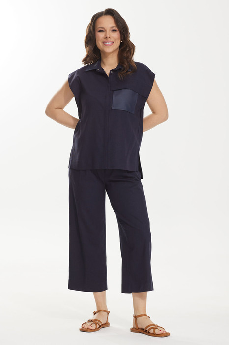 Стильный комплект из жилета и брюк. Комплект выполнен из  натуральной смесовой ткани с добавлением льна и хлопка. Жилет прямого кроя с центральной застежкой на скрытые планкой металлические кнопки.  Горловина обработана отложным воротником на стойке, выполненным из мягкой эко кожи.  Жилет притален за счет съемного пояса с пряжкой , выполненного из основной ткани.  Слева на груди расположен накладной карман из мягкой эко кожи.  Спинка жилета длиннее переда на 3,5 см.  Укороченные брюки прямого классического кроя с притачным поясом, дополненным эластичной тесьмой. Застежка гульфик на молнию и пришивную пуговицу. Брюки дополнены удобными боковыми карманами. Длина жилета от плечевого шва 95см. Длина брюк по боковому шву 90см.