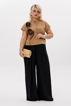 Жакет прямого кроя, на подкладке. с центральной застежкой на пришивные пуговицы. Дополнен боковыми карманами с клапанами. Рукав втачной.  Жакет украшен брошью ручной работы, выполненной из основной ткани. Брюки классического кроя с притачным поясом, дополненным эластичной тесьмой, с застежкой на пришивную пуговицу и молнию. К низу брюки слегка заужены. Посадка средняя. Дополнены функциональными боковыми карманами. Длина жакета от плечевого шва 70 см. Длина рукава 60 см. Длина брюк по боковому шву 97см.