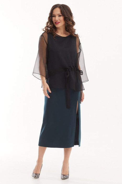 Нарядный комплект из платья и блузы. Платье полуприлегающего силуэта с застежкой по спинке на потайную молнию. Платье выполнено из струящейся плательной ткани с атласным блеском. Слева платье дополнено боковым разрезом. Блуза свободного прямого кроя с регулируемой драпировкой по талии.  Рукав 7/8. Выполнена из воздушной невесомой органзы. Длина платья от плечевого шва 124см. Длина блузы от плечевого шва 65см. Длина рукава 47чсм.