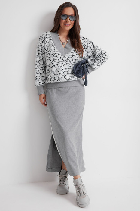 Стильный трикотажный комплект из джемпера и юбки. Джемпер свободного кроя. Выполнен из нежного, слегка пушистого , трикотажа. Горловина V- образная, обработана довязом. Рукав втачной, дополнен притачной манжетой. Низ джемпера слегка присборен и  обработан притачным довязом. Юбка макси с одним боковым разрезом. Выполнена из приятного к телу трикотажа в рубчик. Дополнена отделкой из тесьмы по боковым швам. Юбка с притачным поясом, дополненным эластичной тесьмой. Длина джемпера от плечевого шва 65см. Длина рукава 62см. Длина юбки по боковому шву 90см.