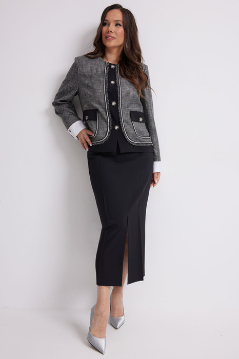 Стильный комплект из жакета и юбка. Жакет прямого кроя, на подкладке, с центральной застежкой на красивые пришивные пуговицы. Рукав втачной, дополнен съемными белыми манжетами. Выполнен жакет из красивой костюмной ткани.  Юбка миди прямого кроя, на подкладке, с удобным разрезом спереди. Дополнена удобными боковыми и накладными задними карманами. Юбка с притачным поясом со шлевками для ремня, с застежкой по спинке на потайную молнию и пуговицу. Длина жакета от плечевого шва 60см. Длина рукава 60см. Длина юбки 83см.