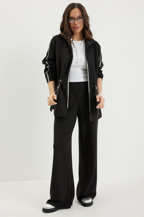 Стильный комплект из парки и брюк, выполненных из мягкого трикотажного полотна в комбинации с жаккардом. Парка свободного кроя, без подкладки. Выпполнена из трикотажа, спинка выполнена из красивого фактурного жаккарда. Парка дополнена красивой серебристой центральной молнией и скрытой кулиской по талии с красивыми серебристыми фиксаторами. За счет них можно приталить , либо сделать свободным силуэт изделия. Рукава слегка спущены и дополнены красивой серебристой тесьмой. Горловина-стойка визуально вытягивает силуэт. Брюки прямого кроя на резинке. Посадка средняя. Дополнены удобными карманами. Длина спинки 70см. Длина рукава 58см. Длина брюк по боковому шву 104 см.
