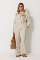 Брючный нарядный женский комплект из двух предметов: струящейся блузки со вставками сетки( по кокетке, по бокам изделия и рукавах), и свободных легких трикотажных брюк-палаццо. Вырез горловины круглый, ракав длиной 3/4, низ рукава собран на резинку, низ блузки фигурный, удлиненный по переду и спинке. Брюки длинные, прямые, с поясом на резинке и двумя карманами в боковых швах. К комплекту прилагается съемный пояс из основной ткани с бахромой по краям. Красивый летящий силуэт данного брючного комплекта выгодно подчеркнет фигуру и скроет любые недостатки. Изделие станет незаменимым для торжесивенных мероприятий.