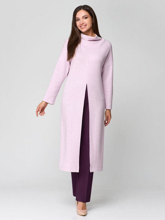 Комплект состоит из удлиненной туники и брюк. Туника из мягкого теплого трикотажного полотна со швом по переду и удлиненым разрезом. Линия плеча спушенна, рукав одношовный, воротник стойка. Брюки прямые от линии калена, застежкой в боковом шве на потайную молнию. Длина туники 115 см, длина рукава от плеча 66 см. длина брюк 108 см