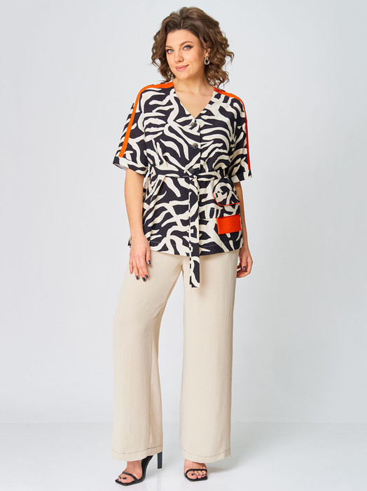Летняя, стильная двойка. Именно этот комплект вам нужен. Комплект состоит из блузки и брюк. Блузка прямого силуэта выполнена из вискозной ткани. С контрастной оранжевой отделкой лампас по плечевому срезу и рукаву, клапану и мешковине кармана. Спущенная линя плеча, рукав короткий с отложной манжетой. По левой полочке заложена складка и имитация кармана. Спинка со средним швом. По бокам имеются разрезы. Застёжка центральная на 5 пуговиц и петель. Брюки прямого силуэта, на притачном поясе с резинкой, по бокам расположены наклонные карманы. По брюкам прострочены контрастные отделочные строчки.
