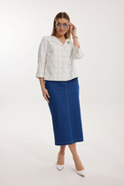 Комплект женский 2-ух предметный, состоящий из жакета и юбки. Жакет со спущенной линией плеча и цельнокроеным рукавом. По переду отрезная кокетка, воротник- стойка, рукава и планки. По переду настрочены нагрудные клапаны. Синка со средним швом. На левом рукаве о низу настрочена нашивка. Центральная застежка по планкам на 5 пуговиц и петель. Низ жакета можно регулировать с помощью эластичного шнура и фиксатора. Жакет без подкалки. Юбка на широкой обтачке А- силуэта, на подкладке. По переднему и заднему полотнищу заложены складки. По бокам расположены наклонные карманы. Застежка сзади на потайную тесьму-молни
