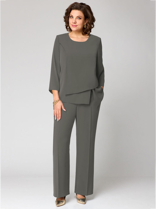 Элегантный женский комплект прямого силуэта из легкой струящейся ткани.Туника  прямого силуэта. Перед состоит из нижней детали и с боковым подрезом и шлицей с левой стороны, нагрудные вытачки идут от плечевого среза . Верхняя деталь переда   ассиметричной формы. Спинка со средним швом и застежкой на потайную тесьму-молнию. Округлый вырез горловины. Рукав втачной одношовный. Брюки прямого силуэта на притачном поясе, с посадкой на талии, с застежкой на тесьму- молнию и  1 пуговицу и петлю,  с боковыми наклонными карманами на передних половинках брюк . По передним  половинкам брюк заутюжены стрелки. Для лучшего прилегания брюк в области талии в поясе со стороны спинки вставлена резинка. Укарашение в комплект не входит.