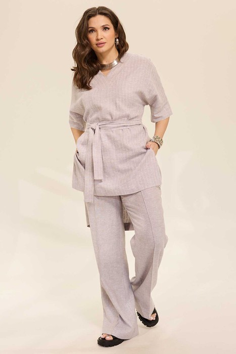 Костюм женский, состоящий из блузы и брюк. Блуза прямого силуэта, с разрезами по бокам. Ассиметричный низ: спинка длиннее переда. Рукав цельнокроеный,  заканчивается притачной манжетой. Горловина V-образная с притачной планкой по линии переда, спинки и рукава. Головина на завязке. Дополнением служит пояс. Брюки по силуэту с легким клешем от колена, по передним половинкам по центру застрочен защип. Карманы боковые накладные. Брюки с застежкой на молнию. Притачной пояс застегивается на петлю-пуговицу и с резинками по бокам. Модель без подкладки.