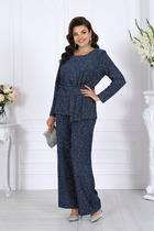 Костюм женский, состоит из блузы и брюк. Рукав у блузы - реглан, со сбокой по окату. Рукав расширенный до линии локтя. По переду и спинке блузы - притачная планка с резинкой. Низ блузы с притачным поясом и резинкой. Брюки на резинке, свободные, прямые, с карманами в боковых швах.