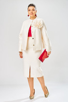 Костюм женский, состоящий из блузы и брюк. Блуза прямого силуэта, с разрезами по бокам. Рукав цельнокроеный, заканчивается притачной манжетой. Горловина V-образная с притачной планкой по линии переда, спинки и рукава. Головина на завязке. Дополнением служит пояс. Брюки по силуэту с легким клешем от колена, по передним половинкам по центру застрочен защип. Карманы боковые накладные. Брюки с застежкой на молнию. Притачной пояс застегивается на петлю-пуговицу и с резинками по бокам. Модель без подкладки.