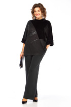 Костюм женский состоит из блузы и брюк. Блуза свободная, А-силуэта, рукав втачной. Спинка со средним швом, заканчивающимся на воздушную петлю-пуговицу. По низу изделия и низу рукава декоративные детали из пайеток. Брюки палаццо, на притачном поясе с резинкой и тесьмой. У брюк - боковые карманы.