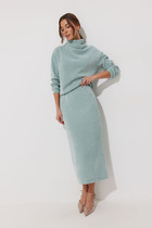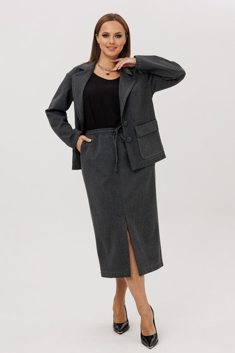 Юбка прямая на резинке и завязке, с центральным швом, заканчивающимся разрезом. Жакет и юбка отстрочена декоративной контрастной строчкой.