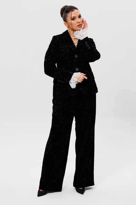 Этот черный бархатный костюм (жакет и брюки) — воплощение вечерней элегантности. Комплект из жакета и чуть прямых брюк на подкладке станет основой для безупречного праздничного образа. Жакет с притягивает взгляды и красиво переливается при свете софитов и вечерних огней, делая его идеальным выбором для выхода в ресторан, театр или на новогодний корпоратив. Крой жакета позволяет комбинировать его с брюками и юбками с высокой талией, визуально вытягивая силуэт. Бархатные брюки (на резинке) прямого кроя выгодно оттеняют нарядный верх и обеспечивают комфорт. Такой костюм для праздника можно носить с кружевной или шелковой блузкой, создавая разные стилистические вариации. Этот элегантный костюм подчеркнет ваш безупречный вкус и станет выигрышной инвестицией в гардероб. Модель можно дополнить кружевными манжетами (арт. 1285м).