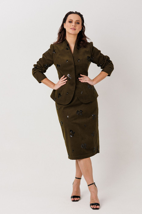 Элегантный костюм-двойка (жакет и юбка), выполненный из штруксовой ткани с декоративной вышивкой пайетками в виде цветочных мотивов, создающих эффект люминесценции при движении. Жакет на подкладке, с приталенным силуэтом застегивается на две потайные кнопки, обеспечивающие аккуратный внешний вид и скрытую застежку. Юбка-карандаш чуть ниже колена, с задней шлицей гарантирует свободу движений и подчеркивает строгий крой. Пояс юбки на обтачке, застежка на молнию, частичная резинка по талии. Задняя шлица юбки — функциональный элемент, обеспечивающий удобство при ходьбе и соответствующий стандартам костюмного кроя. Юба на подкладке.