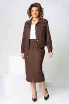 Костюм женский, состоящий из трикотажного жакета без подкладки и брюк. Жакет полуприлегающего силуэта, отрезной по линии талии, с двухбортной застежкой. Перед с рельефами и почками, выкроенными по косой. Спинка с центральным швом, с рельефами и бочками по косой. Рукав втачной, одношовный, внизу со складкой и декоративной пуговицей. Брюки из костюмной ткани, зауженные к низу, на резинке. У брюк пояс на резинке, боковые карманы, имитация гульфика.