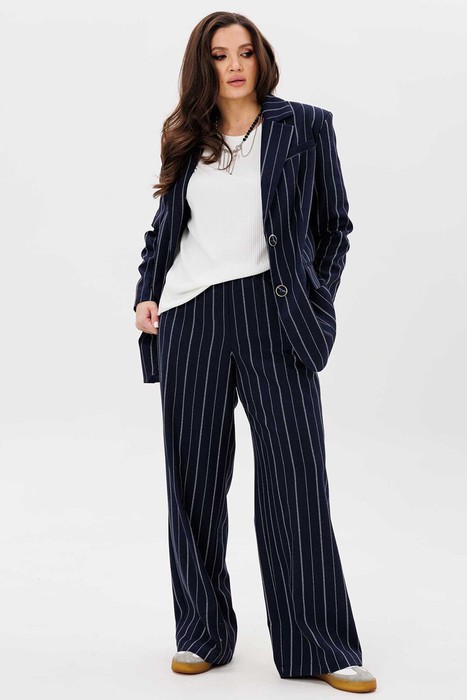 Костюм женский. Состоит из жакета и брюк. Ткань костюмная. Жакет однобортный, прямого силуэта с закругленными бортами, застегивавется на 2 петли и пуговицы. Карманы в рамку с клапаном. Спинка со средним швом, заканчивающимся шлицей.Рукав втачной двухшовный. Задний шов рукава с имитацией шлицы и 4мя отделочными пуговицами. Воротник стоячиц отложной. На левой полочке, в области груди, имитация кармана с листочкой. Брюки на резинке и шнурке, прямые, с боковыми карманами.