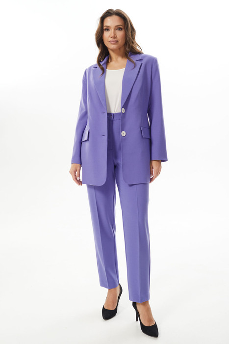 Комплект женский состоит из жакета, брюк и топа. Жакет полуприлегающего силуэта удлинённый, с центральной застёжкой на две прорезные петли и пуговицы.  Перёд жакета с талевыми вытачками и прорезными карманами и клапанами. Лацканы классической формы. Спинка со средним швом. Перед и спинка с рельефами от проймы до низа изделия. Рукава втачные двух шовные. Жакет на подкладке. Брюки женские с высокой посадкой, зауженные к низу, на притачном поясе, по спинке вытачки. По переду застёжка молния с гульфиком и откоском, вытачки, карманы. Пояс застёгивается на прорезную петлю и пуговицу. Топ свободного силуэта без рукава. По переду нагрудные вытачки, спинка с центральным швом. Горловина круглая