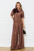Двухпредметный комплект, который состоит из жакета и брюк. Жакет полуприлегающего силуэта с ассиметричной полочкой, на которой выполнен карман в рамку. Рукав втачной, двухшовный. Спинка со средним швом и талиевыми вытачками. Воротник пиджачной формы. Жакет на подкладке. Брюки прямые, по низу с манжетой, сверху на притачном поясе-кокетке, по бокам с карманами. Застежка на тесьму-молнию в среднем шве.