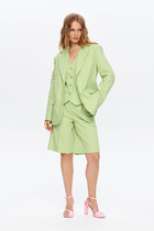Костюм женский, состоящий из брюк и жилета. Жилет полуприлегающего силуэта с рельефами по переду и спинке, отрезной по линии талии. Низ жилета ассиметричной формы. На баске с одной стороны обработаны прорезные карманы в рамку, один из которых функциональный. Застежка двубортная на петли-пуговицы и декоративную пату. Жилет на подкладке. Брюки прямые, сверху на притачном поясе, сзади с резинкой. На передних половинках обработаны карманы. Застежка на тесьму-молнию. Данный комплект можно дополнить блузой, что позволит Вам создать разные образы.
