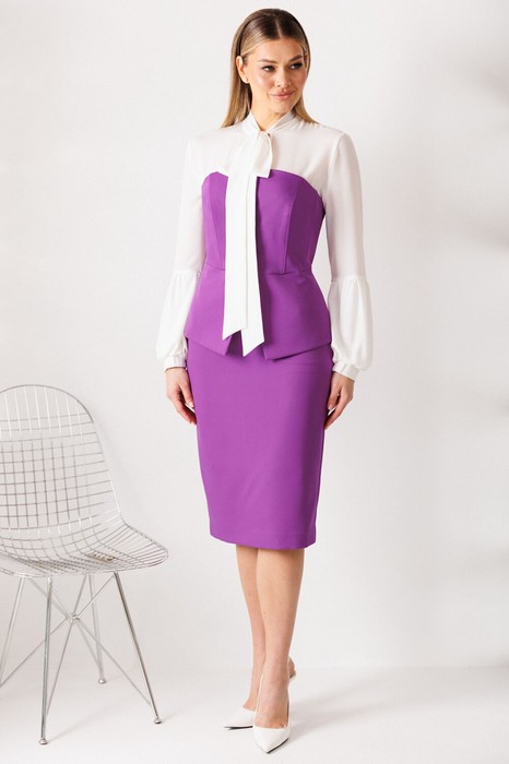 Этот нарядный костюм представляет собой элегантное и утонченное решение для особых случаев. Костюм состоит из корсета и юбки. Топ-корсет прилегающего силуэта с регилином по рельефам по переду и спинке, который обеспечивает дополнительную жёсткость и посадку на фигуре. Застёжка центральная бортовая на 6 петель и пуговиц. Низ переда фигурной заострённой формы, что подчёркивает элегантный силуэт. Модель идеально подходит для создания строгих, утонченных образов и может использоваться как в качестве элемента вечернего наряда, так и для повседневных образов с более нейтральными деталями. Наденьте его с нашей юбкой - это беспроигрышный дуэт, где игривость и строгость подчеркивают друг друга. Юбка прямая, зауженная к низу, сверху на притачном поясе. Застежка на тесьму-молнию в среднем шве, который переходит в шлицу. Костюм на подкладке.