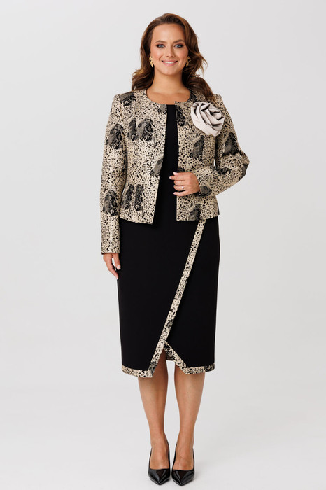 Платье полуприлегающего силуэта со спущенной линией плеча, выполненное из костюмно-плательной ткани (тянется) с отделкой из жаккардовой ткани. Перед платья состоит из двух частей. Нижняя часть платья отрезная по линии талии с ассиметричным подрезом и отрезными планками из отделочной ткани. Верхняя часть переда ассиметричной формы, отлетная с отделочным люверсом и поясом, с отрезными планками планками из отделочной ткани. По спинке – средний шов, потайная застежка-молния и талиевые вытачки. Низ переда и спинки, низ рукавов оформлен отрезными планками из отделочной ткани. Горловина округлой формы.