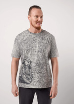 Костюм мужской, состоящий из футболки и шорт. Футболка однотонная с принтом на груди; модель свободная, со спущенной линией плеч, втачными рукавами, овальным вырезом горловины. Шорты из полотна с набивным рисунком эксклюзивного дизайна, с боковыми карманами с обтачными входами, на притачном поясе с отстроченной эластичной тесьмой.