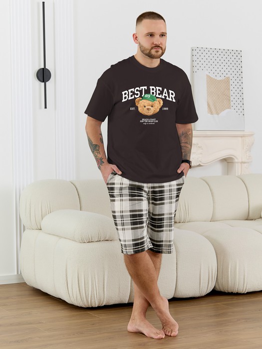 Костюм мужской, состоящий из футболки и шорт. Футболка однотонная с принтом на груди; модель свободная, со спущенной линией плеч, втачными рукавами, овальным вырезом горловины. Шорты из полотна с набивным рисунком эксклюзивного дизайна, с боковыми карманами с обтачными входами, на притачном поясе с отстроченной эластичной тесьмой.