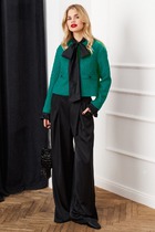 Костюм трехпредметный: состоит из джемпера, брюк и топа. Джемпер прямого силуэта на подкладке. Рукав втачной. По переду карманы, застёжка на тесьму-молнию. Воротник прилегающий. Длина рукава 60 см, длина изделия 56 см. Топ на тонких регулируемых бретелях. Брюки-юбка свободного кроя из трикотажного гофре, верхний срез представлен широкой резинкой.