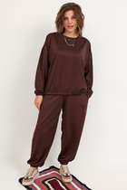 Костюм двухпредметный: состоит из джемпера и платья. Элегантный джемпер-кейп прямого свободного силуэта с спайетками. Горловина с цельнокроеным воротником-стойкой. Рукав втачной широкий, от линии локтя до запястья есть дополнительное отверстие для рук. Платье прямого силуэта, с небольшим расширением к низу, длиной макси. Перед с нагрудной вытачкой из бокового шва. Вырез горловины переда и спинки имеют V-образную форму.