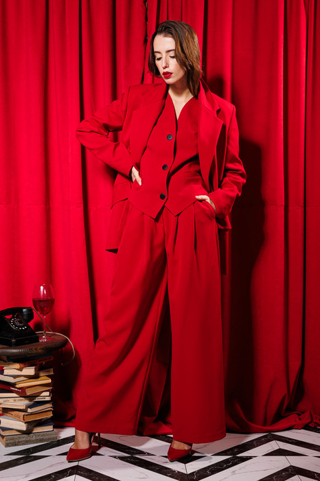 Костюм трехпредметный: состоит из жакета, жилета и брюк. Жакет прямого силуэта на подкладке. Спинка со средним швом. На полочке нагрудная вытачка переведена в прорезной карман с клапаном и листочкой. Линия плеч расширена. Рукава втачные, длинные, двухшовные. Воротник отложной, пиджачного типа на отрезной стойке. Однобортная застежка на петли и пуговицы. Жилет полуприлегающего силуэта на подкладке. По переду вытачка, переходящая в подрез, функциональный карман. Застежка на петли-пуговицы. По спинке вытачки и хлястик. Элегантные брюки прямого кроя с боковыми карманами с отрезным бочком. Застежка на молнию и пуговицу. По переду - складки. Задние половинки с талиевыми вытачками и прорезными карманами с листочкой. Верхний срез обработан притачным поясом. Низ обработан швом в подгибку.