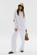 Костюм двухпредметный: состоит из джемпера и брюк. Джемпер свободного силуэта с округлой горловиной. Рукав комбинированного кроя, с передними и задними швами. Верхняя и нижняя часть рукава образуют между собой разрез. Карманы в боковых швах. По переду изделие декорировано фигурным бантом. Брюки со стрелкой свободного кроя, верхний срез представлен широкой резинкой, с карманами.