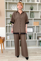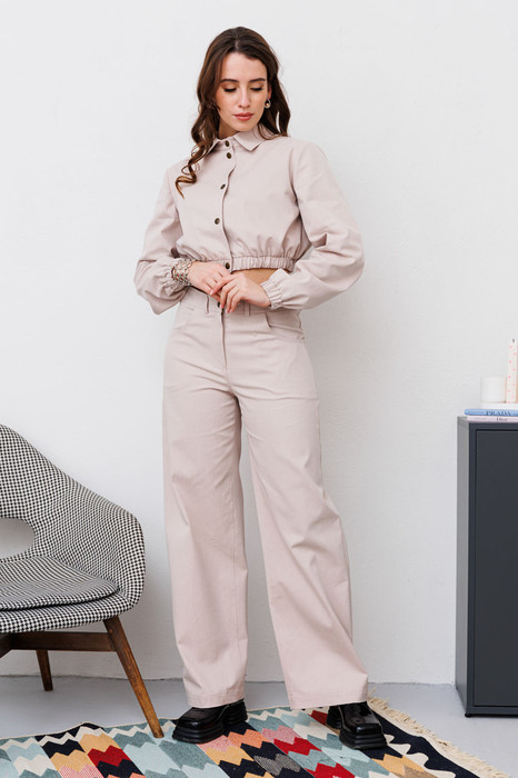 Костюм двухпредметный: состоит из рубашки - кропа и брюк. Укороченная рубашка из денима. Модель свободного кроя собрана на резинку по нижнему краю. Отложной воротник. Изделие застегивается на кнопки. Брюки прямого силуэта большого объёма. Линия талии занижена. Пояс притачной. На передних половинках брюк карманы с отрезным бочком. На задних половинках брюк отрезная кокетка и накладные карманы.