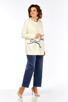 Костюм двухпредметный: состоит из жилета и брюк. Жилет полуприлегающего силуэта на подкладке. По переду вытачка, переходящая в подрез, функциональный карман. Застежка на петли-пуговицы. По спинке вытачки и хлястик. Брюки свободного кроя, верхний срез представлен широкой резинкой, с карманами.