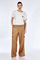 Костюм трехпредметный: состоит из жилета, брюк и жакета. Жилет двубортный прямого кроя объёма оверсайз. Застёжка фигурная на петли и пуговицы. Карманы - листочки. Жакет прямого силуэта на подкладке. Спинка со средним швом. На полочке нагрудная вытачка переведена в прорезной карман с клапаном и листочкой. Линия плеч расширена. Рукава втачные, длинные, двухшовные. Воротник отложной, пиджачного типа на отрезной стойке. Однобортная застежка на петли и пуговицы. Отделочные детали из трикотажного гофре по низу рукава и самого изделия создают имитацию рубашки. Брюки прямого кроя, с карманами.По переду боковой карман, застежка на тесьму-молнию и пуговицу. По спинке верхний срез  представлен резинкой. Галстук не входит в комплект.