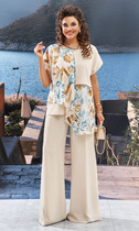 Костюм двухпредметный: состоит из рубашки и юбки. Рубашка прямого кроя со спущенной линией плеча. Горловина обработана рубашечным воротником с отрезной стойкой. Застёжка центральная на кнопки. Есть нагрудные карманы и в боковых швах. Низ рукава обработан притачной манжетой, застёгивается на кнопки. Фигурный низ. Изделие без подкладки. Элегантная юбка прямого силуэта длиной миди с разрезами на переднем и заднем полотнищах. Переднее полотнище с частичным запахом, имитацией боковых карманов с отрезным бочком. Заднее полотнище со средним швом, отрезной кокеткой, накладными карманами. Пояс притачной.