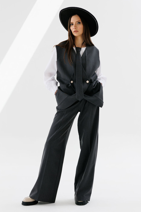 Костюм трёхпредметный: состоит из жилета, брюк и галстука. Жилет двубортный прямого кроя объёма оверсайз. Застёжка фигурная на петли и пуговицы. Карманы - листочки. Галстук классический на резинке. Брюки прямого кроя. На передних половинках брюк карманы с наклонным входом и отрезной боковой частью. Пояс притачной, подкройной. Линия талии приспущена.
