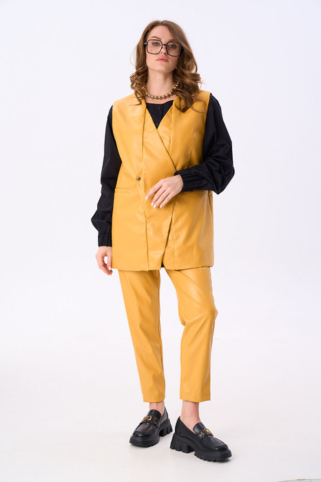 Костюм двухпредметный: состоит из жилета, брюк. Жилет двубортный прямого кроя объёма оверсайз. Застёжка фигурная на кнопки. Карманы - листочки. Брюки с притачным поясом и с карманами в боковых швах.