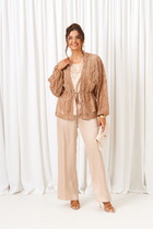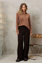 Костюм двухпредметный: состоит из жакета и брюк. Жакет рубашечного типа прямого силуэта с асимметричным низом. Рукав втачной со спущенной линией плеча, фиксируется на пату. Застежка центральная на петли и пуговицы, смещённая по косой. На левой полочке накладной карман с клапаном. Воротник отложной на стойке до половины спинки. Брюки свободного кроя из гладкой ткани сочетают элегантность и комфорт. Широкая резинка на поясе и наличие функциональных карманов подчеркивают удобство модели.